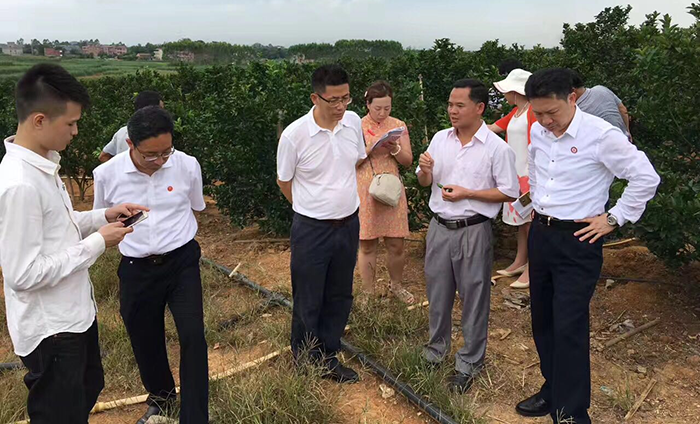 (深圳華錦億爵商業(yè)地產(chǎn)顧問機(jī)構(gòu)總策劃師謝金杏先生(左三)、國家行政學(xué)院政府經(jīng)濟(jì)研究中心副主任研究員、好易農(nóng)科技有限公司董事長張原天博士(右一),深入調(diào)研貴港市種植業(yè)發(fā)展情況)