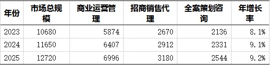 表1:2023-2025年中國商業地產服務行業市場規模(單位:億元)